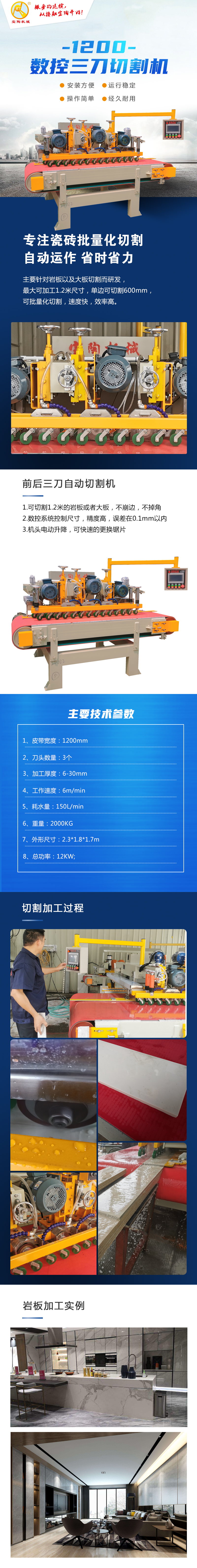 1200型巖板數(shù)控三刀切割機(jī)主要針對(duì)巖板以及大板切割而研發(fā),最大可加工1.2米尺寸,單邊可切割600mm,可批量化切割,速度快,效率高。1.可切割1.2米的巖板或者大板,不崩邊,不掉角2.數(shù)控系統(tǒng)控制尺寸,精度高,誤差在0.1mm以?xún)?nèi)3.機(jī)頭電動(dòng)升降,可快速的更換鋸片